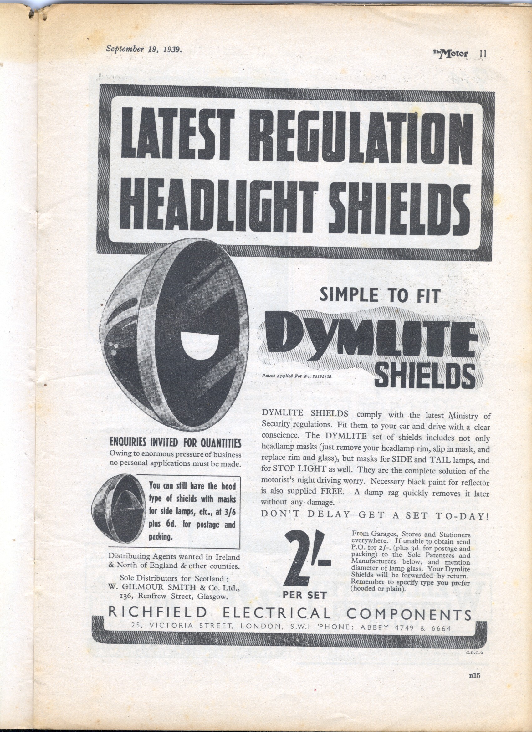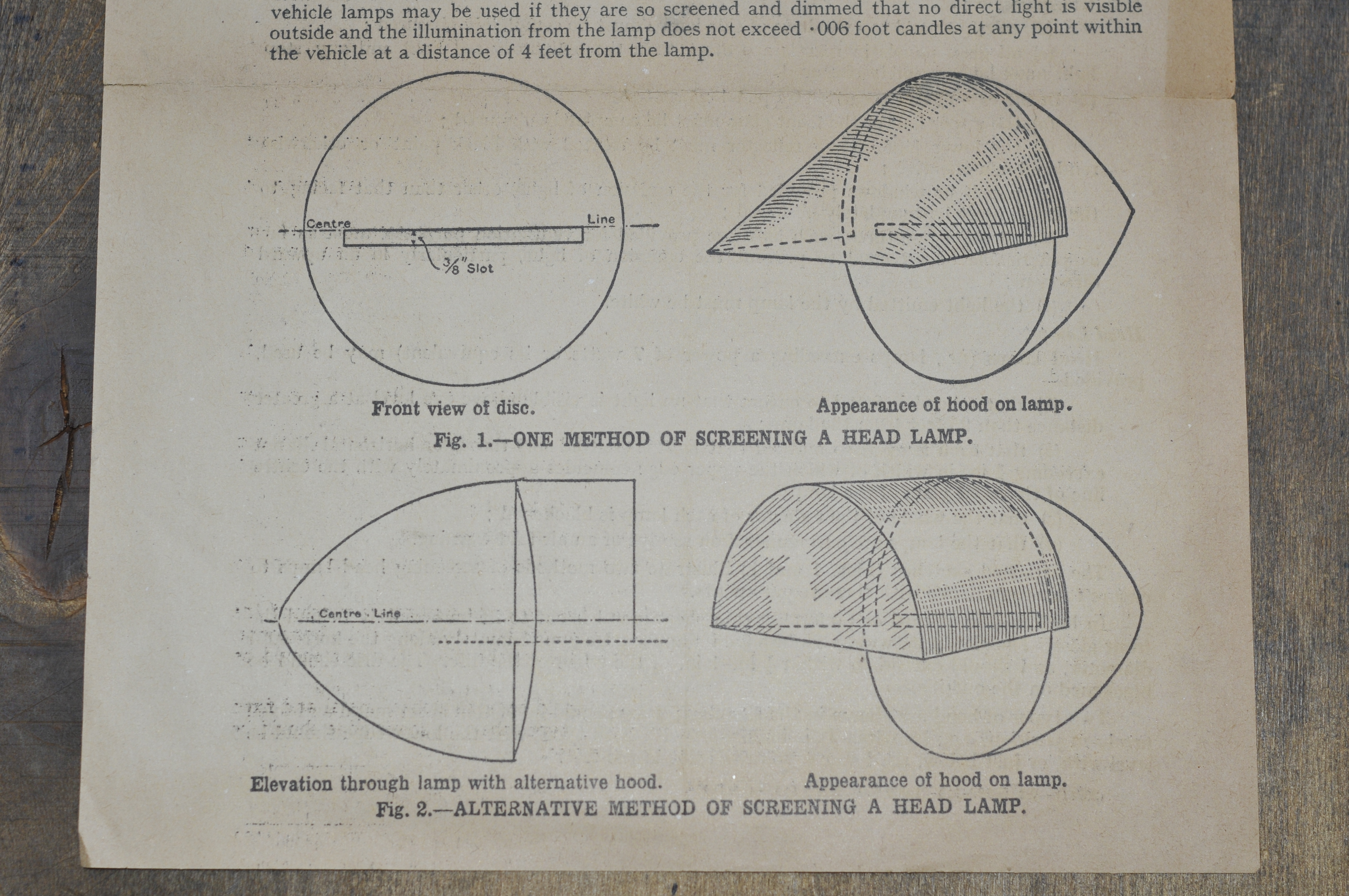 The second regulationsTo meet this set of regulations was a lot easier for the car owner, as the mask could easily be cut from card at home. This did not deter an enterprising company from selling a kit consisting of the headlight mask, diffusing material for the sidelights and the black paint to apply to reflectors.